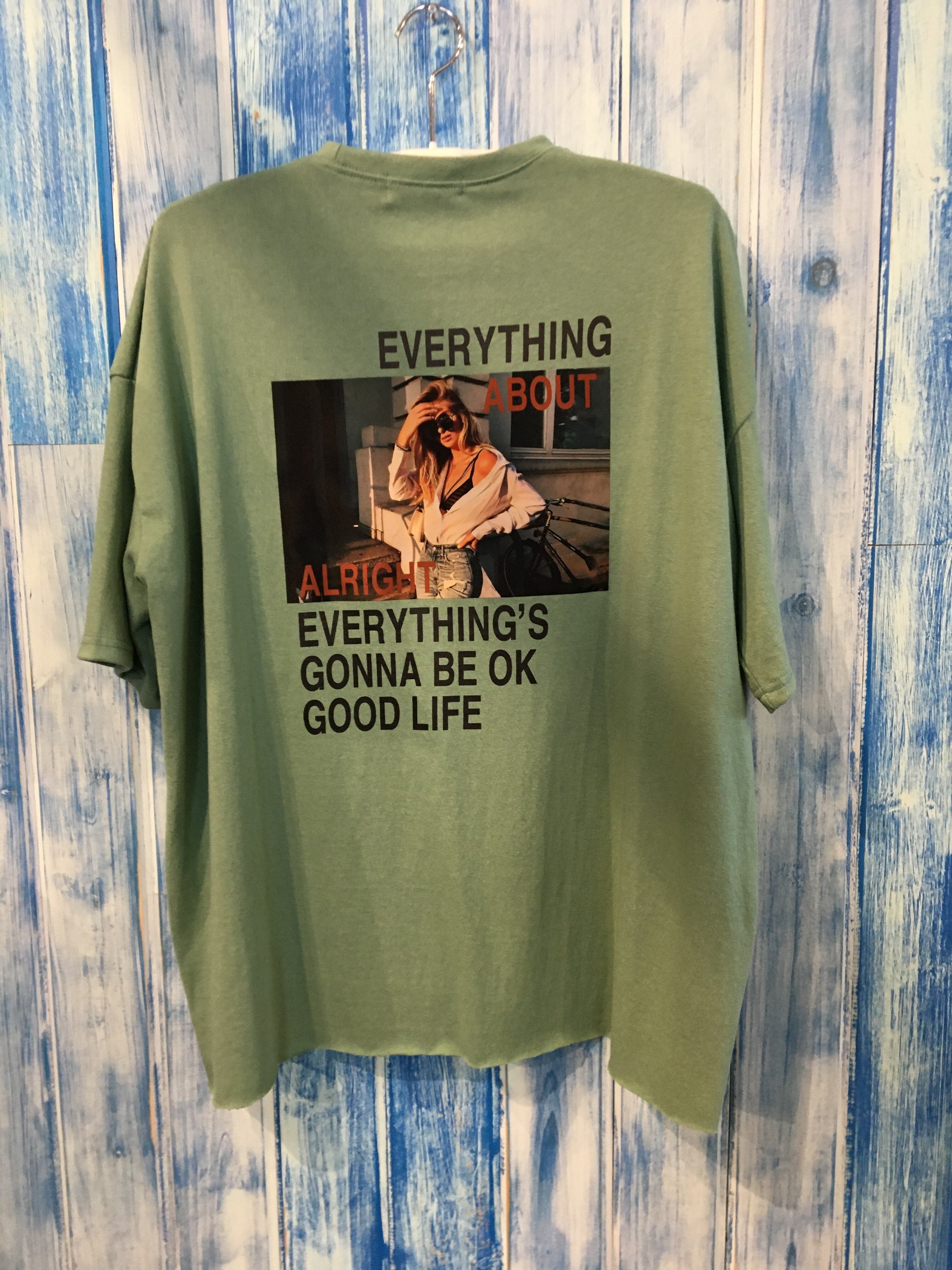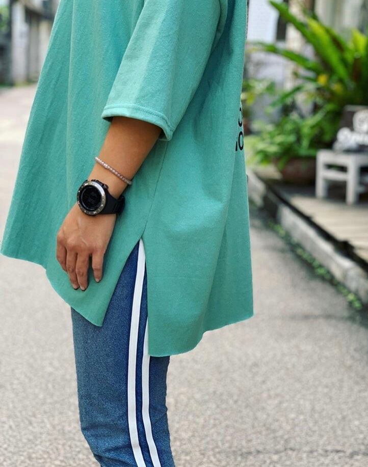 5分袖でルーズシルエットだけど両サイドには長めのスリットが入っていますので、重たく見えない!