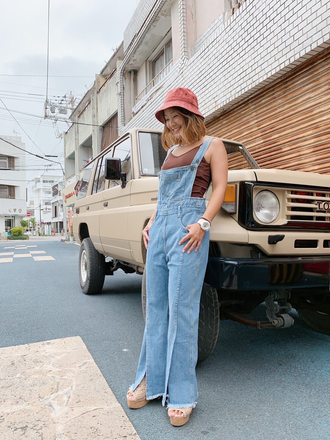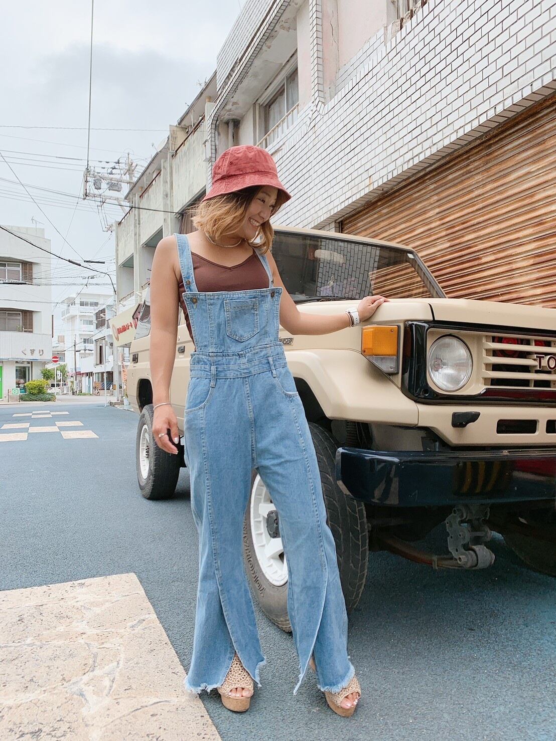 裾のスリットでカジュアルになりすぎるサロペットも大人っぽく。